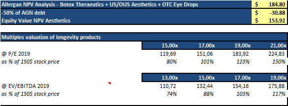 The main takeaway from this analysis is that Allergan looks strongly undervalued on any metrics, taking into account a potential spinoff of the aesthetics franchise. Assuming that the Newco will trade at a premium to the pharmaceutical sector (e.g. 17x P/E 2018 or 15x EV/EBITDA 2018) and assigning around $10B of net debt to this Newco, I estimate a valuation of $130/150 per share for the Aesthetic franchise alone, which is approximately equivalent to the current market capitalization of the entire Allergan.