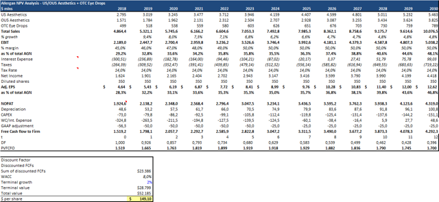 It’s worth noting that I have assumed a WACC of 8% while the Terminal growth of this franchise is 2%, to reflect that the aesthetics franchise will not face pricing pressure and biosimilar competition over the long term. Lastly, I have assumed a 50% operating margin and a tax rate of 14%.