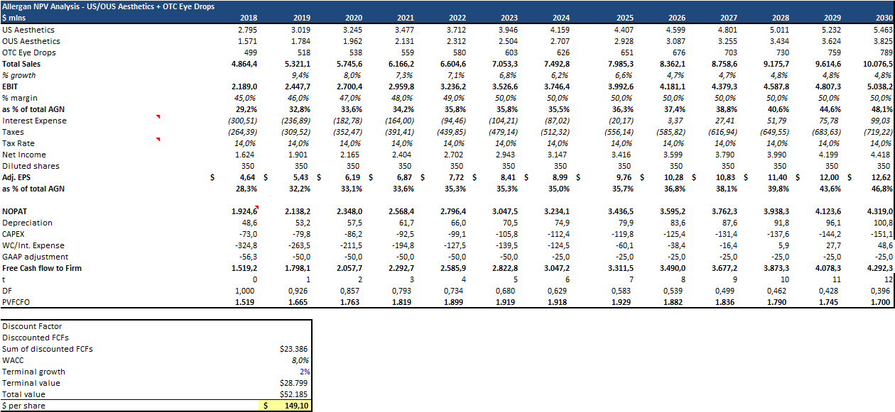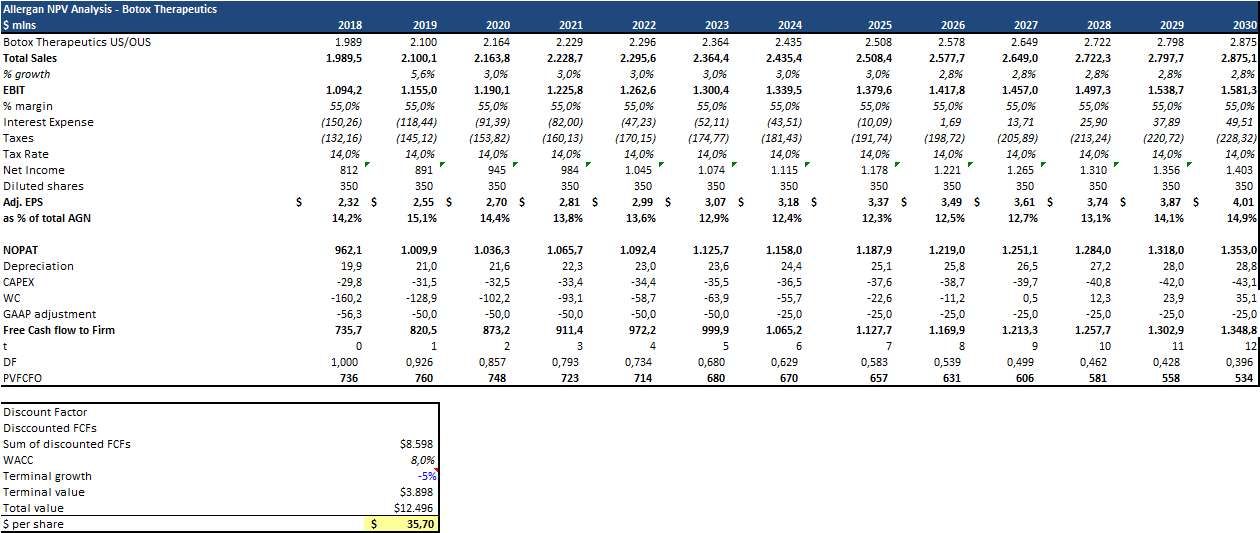 I think that a DCF analysis is the best tool to analyze the intrinsic value of AGN’s aesthetics franchise because it allows to take into account the long-term strengths and threats of this key therapeutic area.