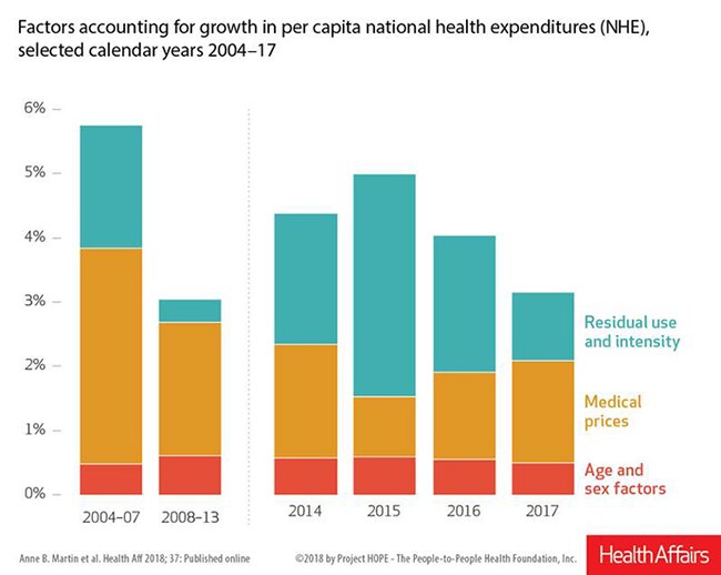 The CMS officials noted that health care spending growth averaged 4.3% per year between 2008 and 2017, compared with an average annual rate of 7.3% in 1998 through 2007.