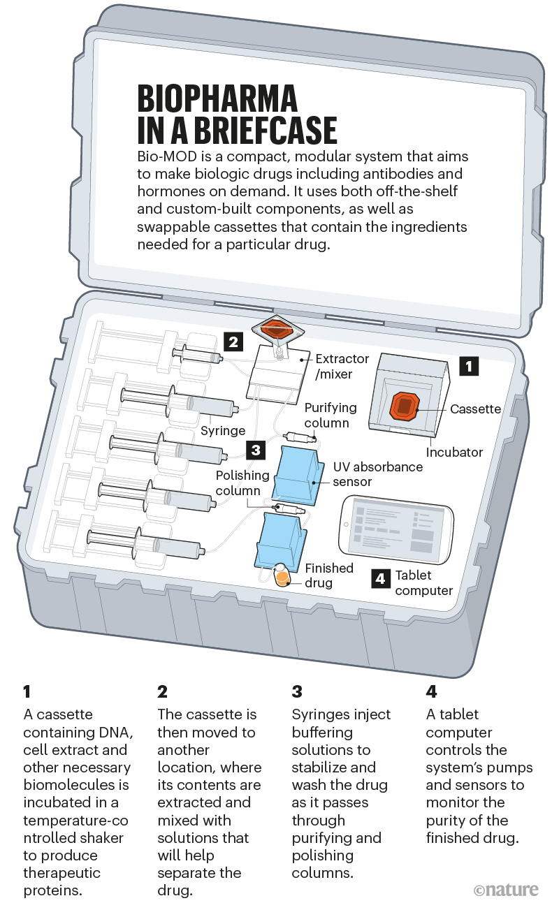 Rao decided to forgo live cells in favour of freeze-dried cellular extracts: RNA, DNA, enzymes and fragments of endoplasmic reticulum, the ribosome-studded network of tubes in which proteins are made (“everything but the membrane and nucleus”, Rao says). He compares his system to baking using a store-bought cake mix (see ‘Biopharma in a briefcase’). The cell-free system is shelf stable for up to two years, which provides some advantages over even the fastest-growing cells, says Michael Jewett, a synthetic biologist at Northwestern University in Evanston, Illinois. The other main benefit is that the freeze-dried cell components produce a more consistent product, he says. “Cell-free systems are a little more like chemistry than biology.”