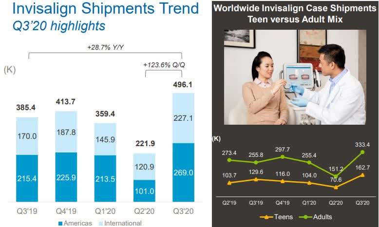- Quick look at the Invisalign shipments trend in Q3 (shipped Invisalign cases to a record 70K doctors, of which 5.8K were first time customers) and worldwide invisalign case shipments teen versus adult mix: