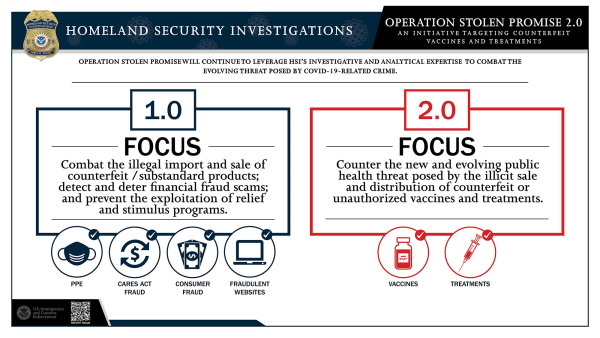Homeland Security Investigations (HSI) – part of Immigration and Customs Enforcement (ICE) – is launching Operation Stolen Promise 2.0 in an attempt to identify and prevent the production, sale and distribution of illicit COVID-19 treatments and vaccines.