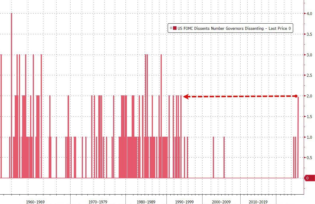 So, while expectations are for no rate-cut today, hints of future dovishness (in the statement as well as in Powell's presser) are a key focus as the potential for the first double-Governor-dissent since 1993 is on the cards...