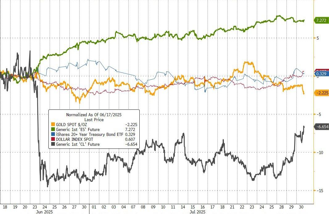 Since the last FOMC meeting (on June 18th), stocks have soared and gold (and crude oil) have been sold while bonds and the dollar have trod water...