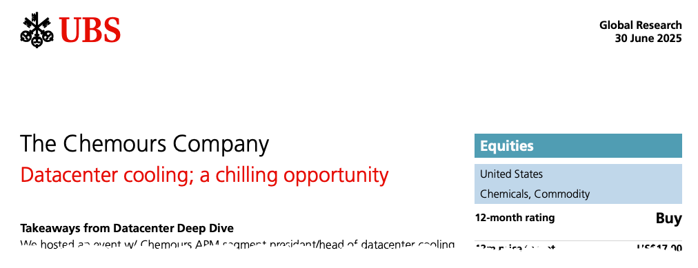 As artificial intelligence chips become more powerful and energy-intensive, legacy air-based cooling systems are fast approaching obsolescence. Chemours is addressing this gap with its next-generation 2-phase liquid cooling technologies, which UBS describes as "purpose-built for more demanding applications in data centers." With thermal loads projected to exceed 200 to 1,000 kW per rack by the end of the decade, advanced cooling is no longer optional. UBS, calling it a "chilling opportunity," sees Chemours well-positioned to lead this transition.
