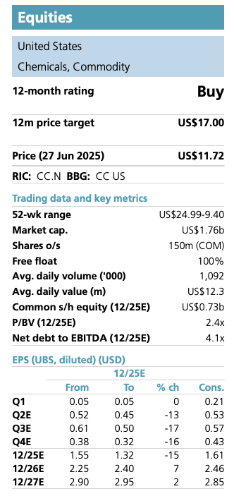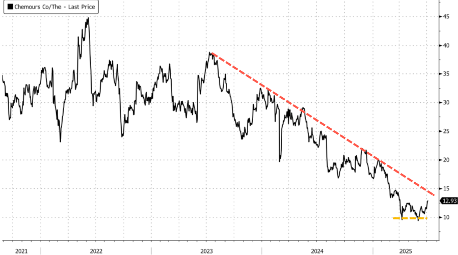 Spector expects Chemours' data center cooling opportunity to be a longer-term growth driver, with no EBITDA contribution currently modeled, but with the potential to reach $10–20M by 2027, $70M by 2030, and $160M by 2035—representing up to 10% of total EBITDA by then. The total addressable market for 2-phase cooling could reach $1.5B by 2035, with Chemours targeting ~1/3 share and 30% margins. While this would add 1–2 percentage points to EBITDA growth later this decade, it would require further capital or partnerships. He maintained a "Buy" rating and $17 price target....