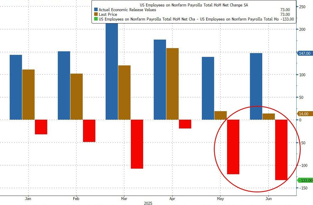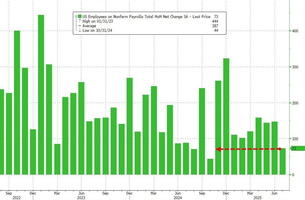 Well, the optimism proved to be very, very wrong, because moments ago the BLS reported job numbers that were very ugly with July printing just 73K, far below the 104K estimate.