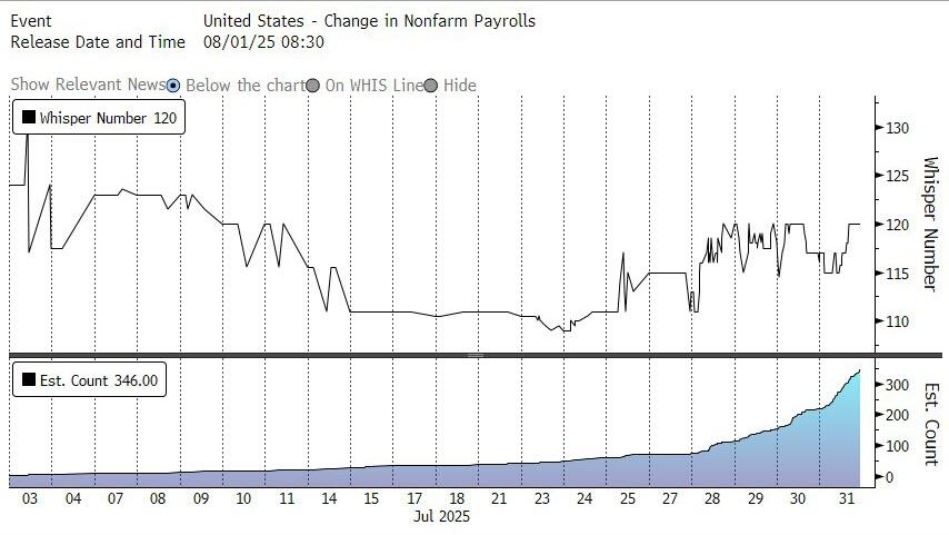 Heading into today's jobs report, sentiment had seen a surprising boost in recent days, with the whisper number rising from just about 110K back to 125K, or where it started the month of July.