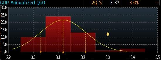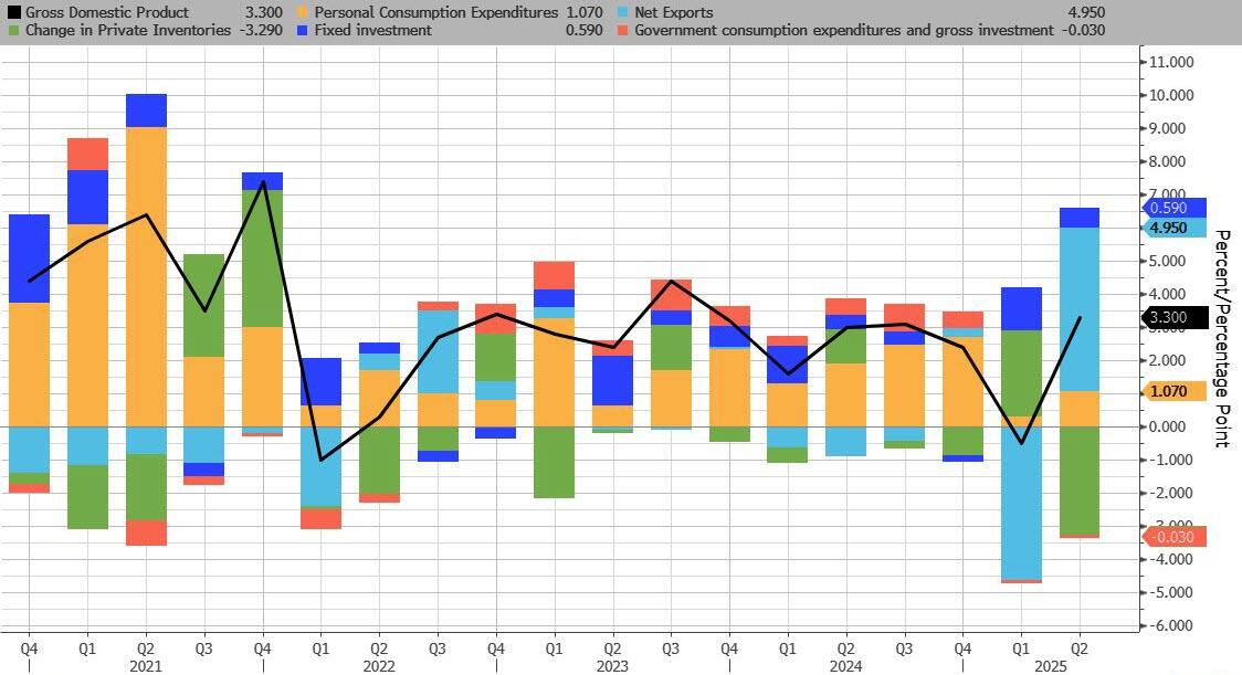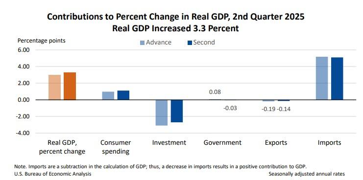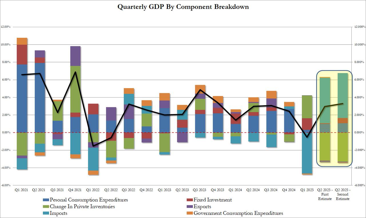 While the number mostly reflects a reversal of the tariff frontrunning seen in Q1 (which dragged GDP sharply lower due to a surge in imports), moments ago we got the BEA's first revision of the Q2 GDP print which already came in red hot at 3.0% one month ago... and was just revised even redder and even hotter to 3.3%, beating estimates of a 3.1% print...
