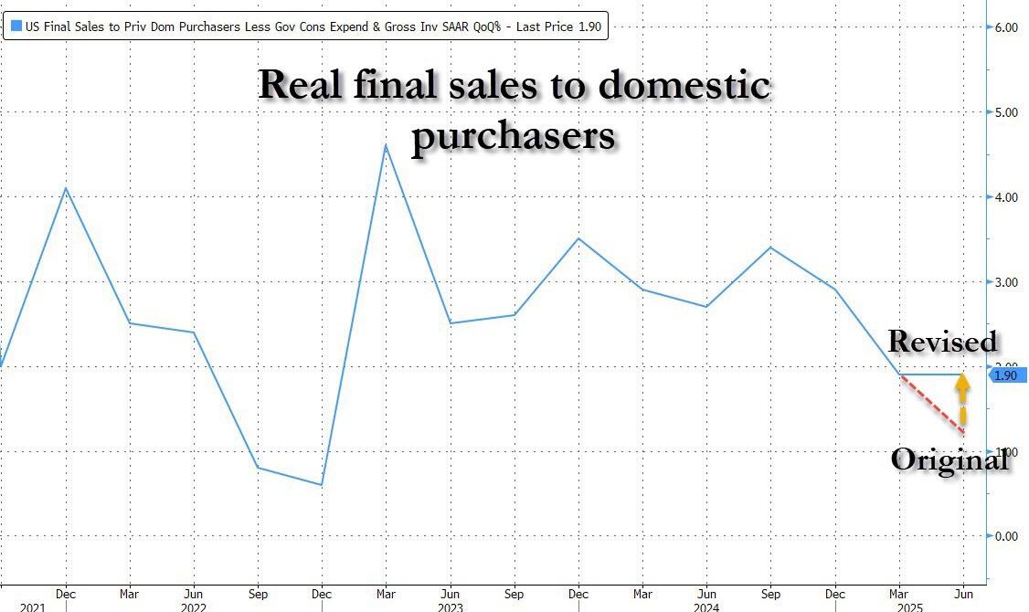 More important than the GDP print even was the sharp upward revision in real final sales to private domestic purchasers, the sum of consumer spending and gross private fixed investment, which surged 1.9% in the second quarter - largely thanks to the huge upward revision in fixed investment - and up 0.7% from the previous estimate.