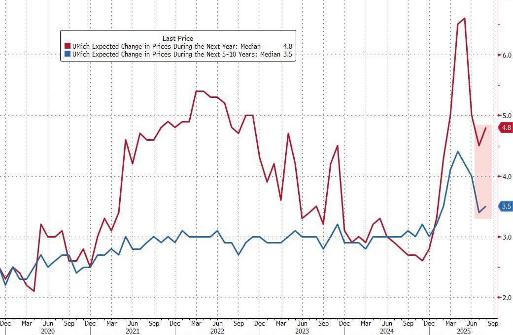 After plunging back to reality for two months, inflation expectations rebounded higher in August (though ended the month lower than preliminary data) with year-ahead inflation expectations rose from 4.5% last month to 4.8% final this month (4.9% prelim) and long-run inflation expectations also lifted from 3.4% in July to 3.5% final (down from 3.9% prelim)...