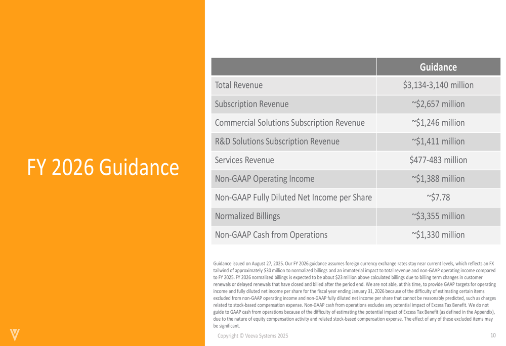 For the full fiscal year 2026, Veeva expects total revenue between $3,134-3,140 million, representing approximately 14% year-over-year growth. This includes subscription revenue of about $2,657 million, split between Commercial Solutions ($1,246 million) and R&D Solutions ($1,411 million). Non-GAAP operating income is projected to be approximately $1,388 million, with non-GAAP earnings per share of around $7.78.