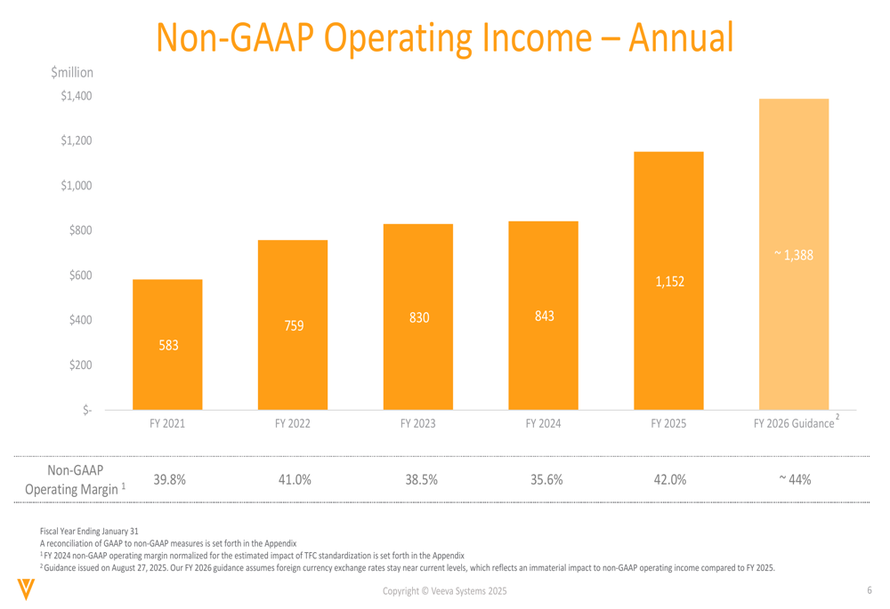 Similarly, Veeva’s non-GAAP operating income has shown strong growth, expected to reach approximately $1.39 billion in FY 2026, up from $583 million in FY 2021. This represents an improvement in operating margin from 39.8% to around 44% over this period.