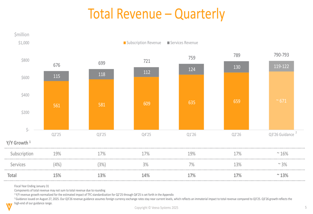 Veeva’s Q2 2026 results revealed robust growth across key financial metrics. Total revenue reached $789 million, representing a 17% increase from the $676 million reported in Q2 2025. This growth was primarily driven by subscription revenue, which grew 18% year-over-year to $659 million, while services revenue increased by 13% to $130 million.