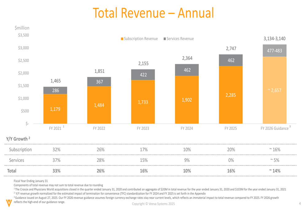 Looking at Veeva’s longer-term performance, the company has maintained consistent growth in annual revenue over the past several years. From FY 2021 to the FY 2026 guidance, total revenue is projected to grow from $1.47 billion to approximately $3.14 billion, representing a compound annual growth rate of over 16%.