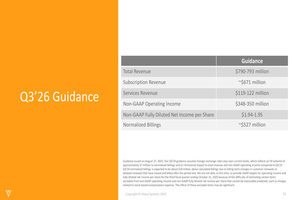 Veeva provided comprehensive guidance for both the upcoming quarter (Q3 2026) and the full fiscal year 2026. For Q3, the company expects total revenue between $790-793 million, with subscription revenue of approximately $671 million and services revenue between $119-122 million. Non-GAAP operating income is projected to be between $348-350 million, maintaining the strong 44% operating margin.