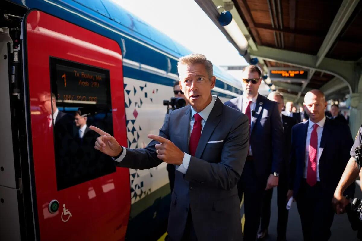Transportation Secretary Sean Duffy (C) boards a NextGen Amtrak Acela train in Washington on Aug. 27, 2025. Andrew Harnik/Getty Images