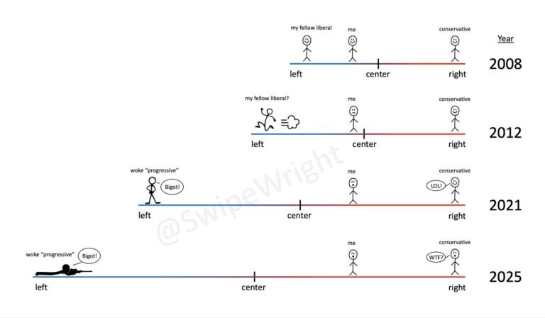 The word “bigotry” has long been associated with backward, conservative values. Manhattan Institute Fellow Colin Wright captured the left’s lurch towards extremism in a viral meme, updated after Kirk’s assassination: