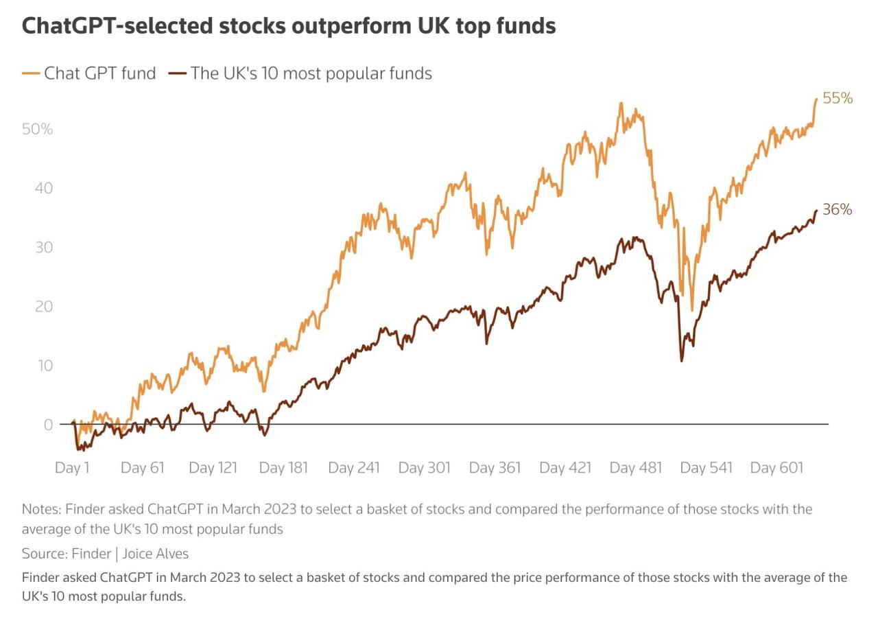 Finder found that 40% of UK respondents had used AI for personal finance. Its own experiment with ChatGPT stock picks in 2023 produced a basket including Nvidia, Amazon, Procter & Gamble and Walmart, which gained 55%—far ahead of leading UK funds.