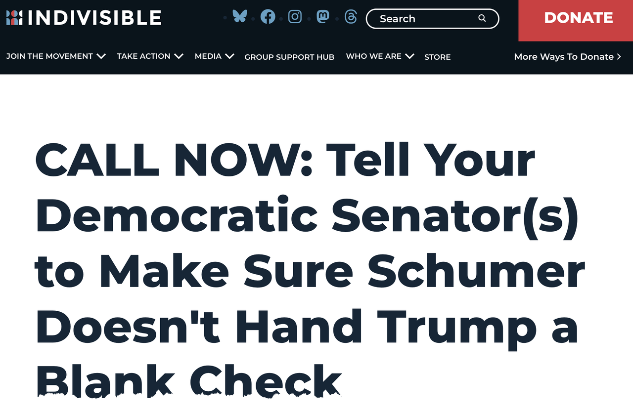 "CALL NOW: Tell Your Democratic Senator(s) to Make Sure Schumer Doesn't Hand Trump a Blank Check," far-left activist group Indivisible wrote on its website.
