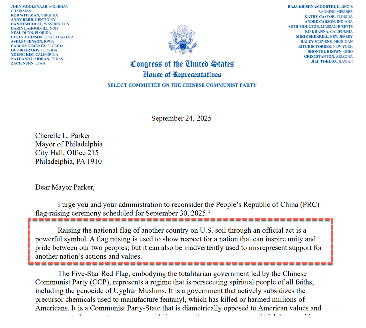 In a letter to Mayor Cherelle Parker, Rep. John Moolenaar of Michigan warned the city not to allow itself "to be exploited as a tool for CCP propaganda," arguing that raising the Five-Star Red Flag "sends the wrong message" in the birthplace of American independence. He cited Beijing's persecution of minorities, the genocide of Uyghur Muslims, and subsidization of fentanyl precursor chemicals as reasons the ceremony should be scrapped.