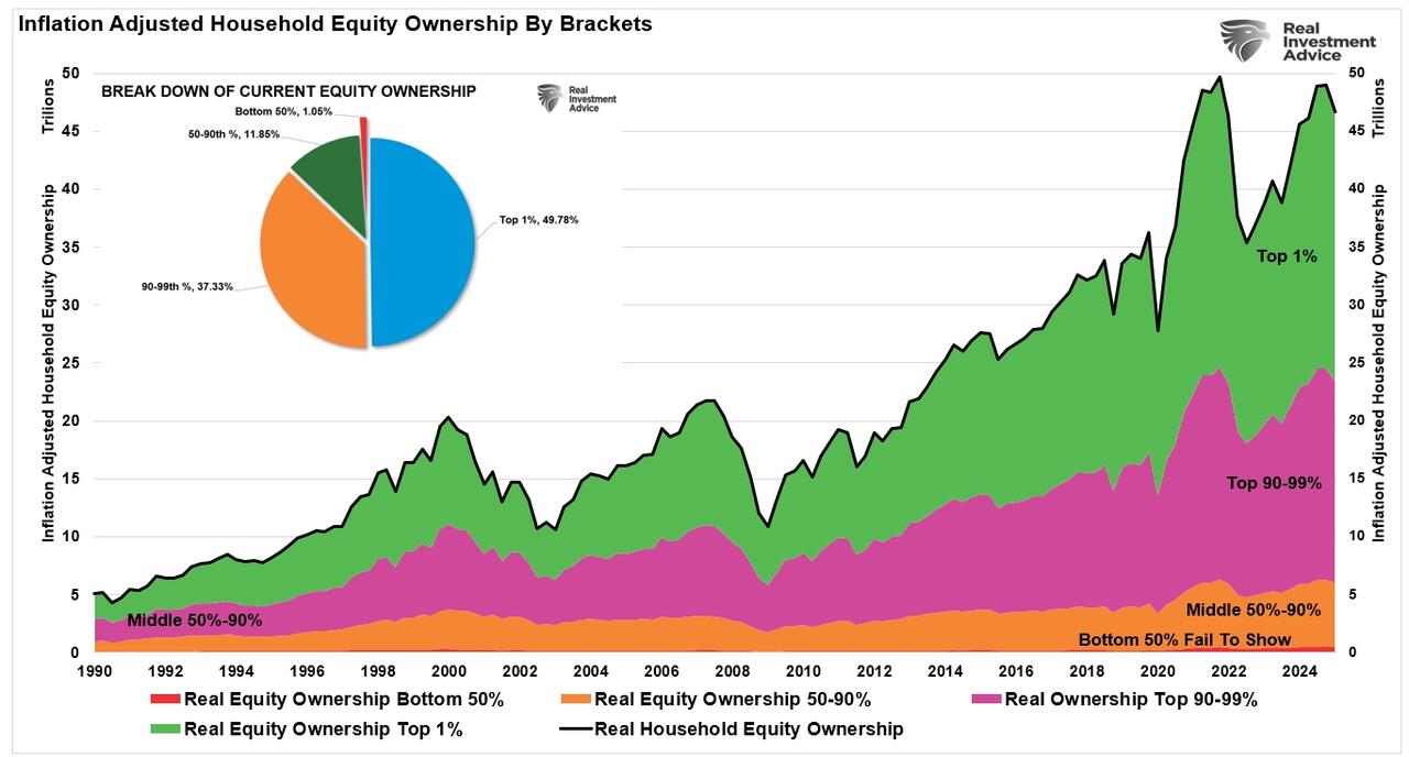 In today’s highly financialized economy, government spending does not circulate efficiently. As noted, much of it gets trapped in financial markets, inflating asset prices rather than stimulating productive investment. Ultra-low interest rates, another hallmark of Keynesian policy, discourage savings and encourage debt-fueled speculation. This distorts capital allocation, causing malinvestment in unproductive assets like meme stocks, speculative real estate, and unprofitable tech ventures. Most benefits remain trapped in the top 10% of the economy, which owns roughly 88% of the inflation-adjusted financial assets.