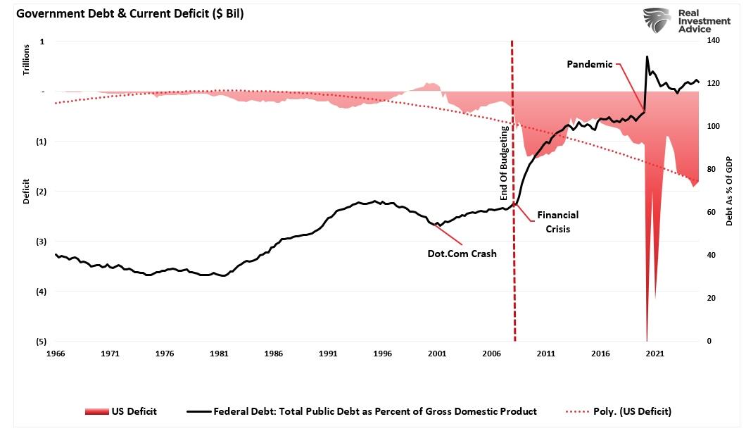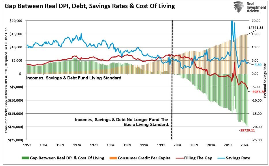 For the last 40 years, each Administration and the Federal Reserve have continued to operate under Keynes’s monetary and fiscal policies, believing the model worked. The reality, however, is that most of the economy’s aggregate growth is financed by deficit spending, credit expansion, and a reduction in savings.