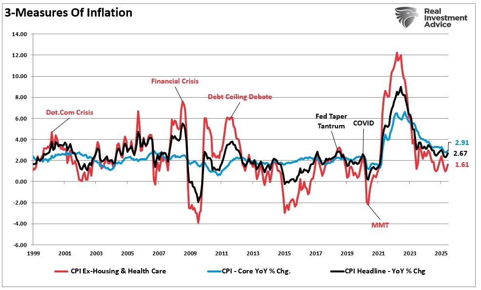 Crucially, inflation, excluding housing and healthcare, surged to nearly 12% during the pandemic-stimulus-infused spending spree. However, today, as the economy slows and the stimulus fades from the system, that inflation rate has declined to just 1.61%.