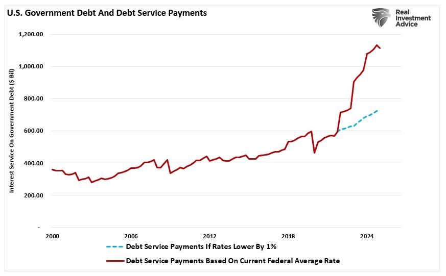 Perhaps the greatest misconception perpetuated by Keynesian economists is that debt-financed stimulus is a free lunch. In reality, servicing the debt and rising debt service costs become a significant economic headwind. The Congressional Budget Office projects that U.S. interest payments will exceed national defense spending in the coming years and approach $1.5 trillion annually by 2030. Of course, that is assuming that rates stay where they are currently. The next crisis, which has become more common since the turn of the century, will significantly lower rates. As shown, a reduction in rates by 1% would dramatically impact future liabilities.