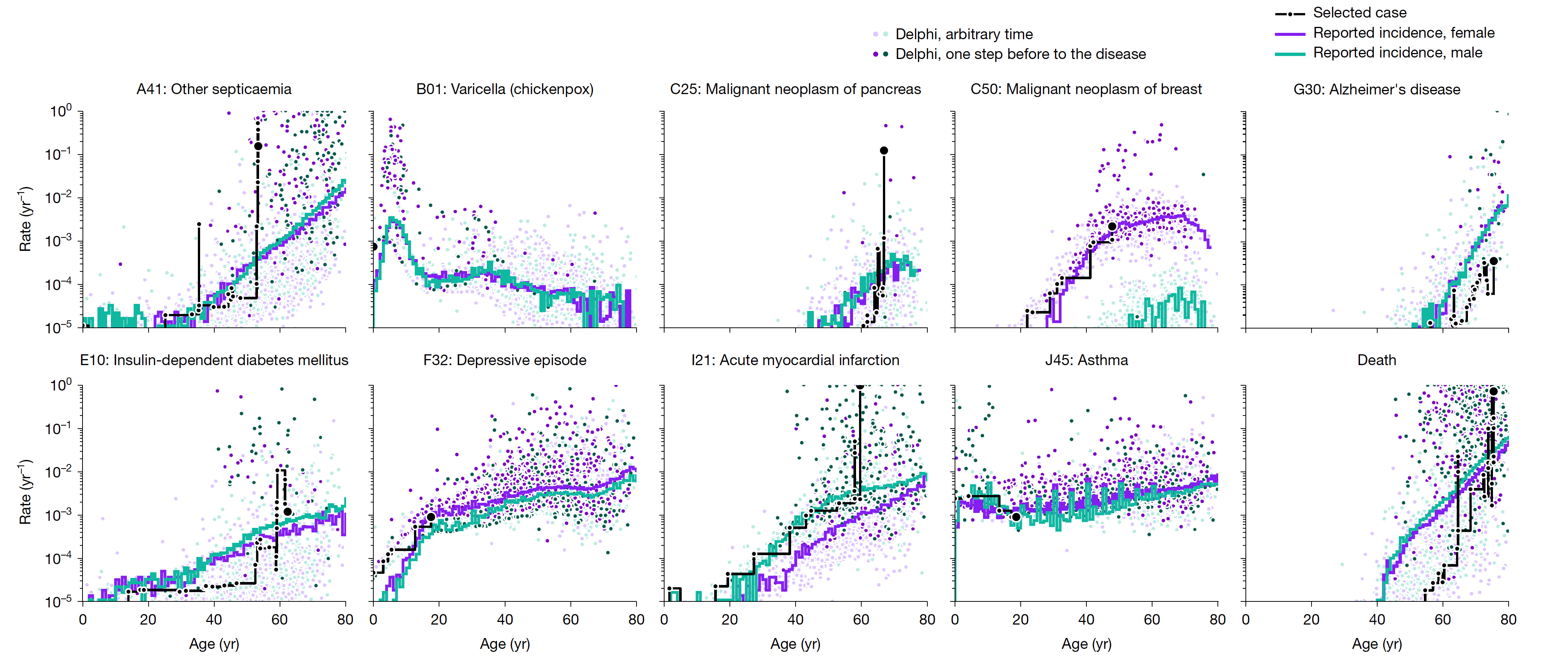 Below is the prediction of 10 diseases/conditions by the Delphi model and actual occurrence, specific to age.