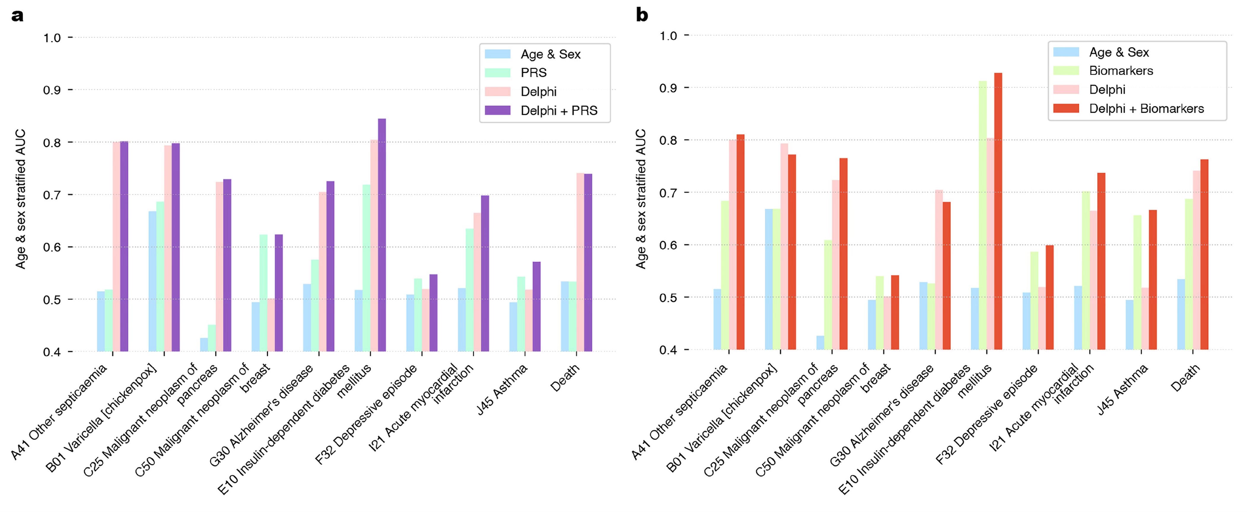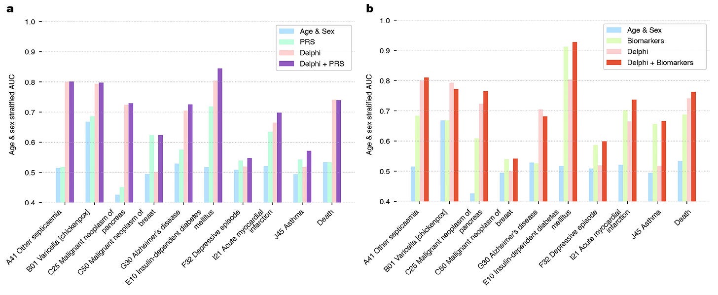 The model did not include many other layers of data such as polygenic risk score (PRS) or genome sequence, biomarkers, unstructured text from medical records, epigenetic or organ clocks, and several other potential layers that could be added. You can see how adding polygenic risk scores (at left below) or biomarkers (at right below) to the Delphi model took it even higher in accuracy for many diseases.