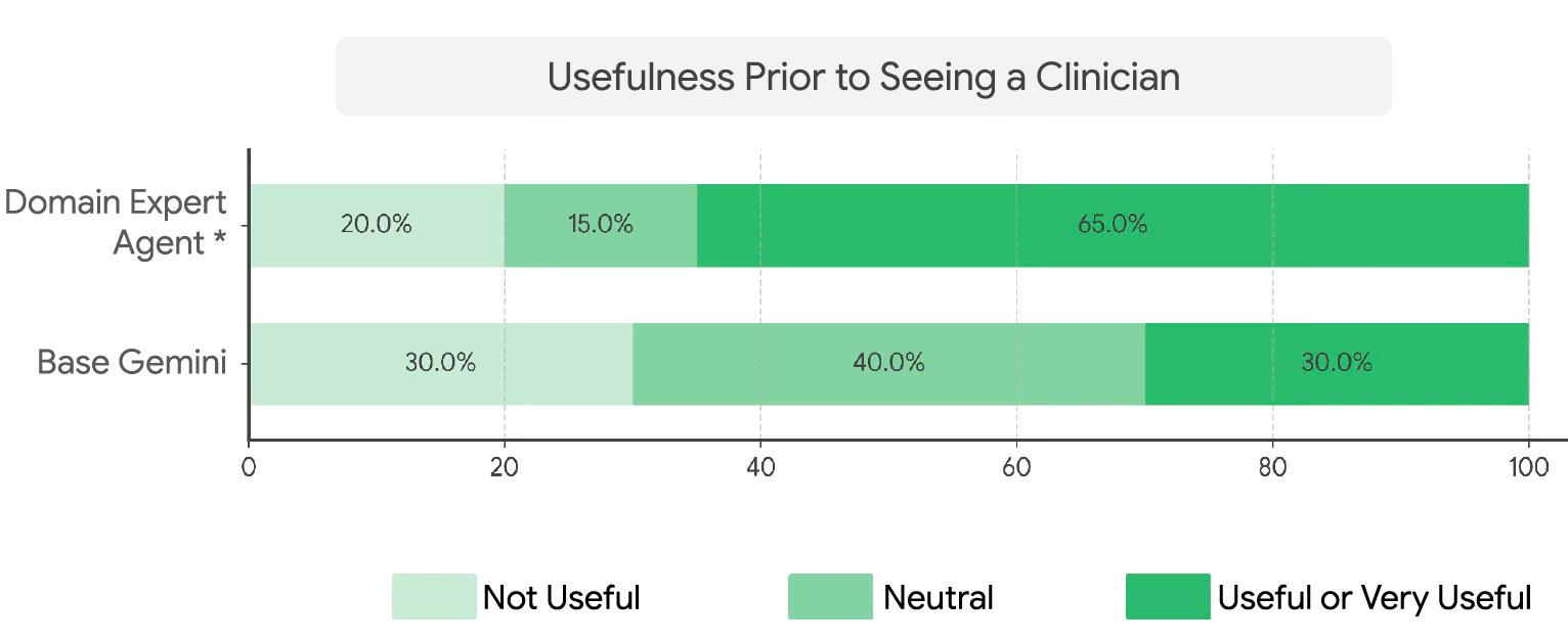 The PHA performed quite well. Compared with base model (Gemini), 65% of the summaries generated were found useful by clinicians compared with 30% of the base model.