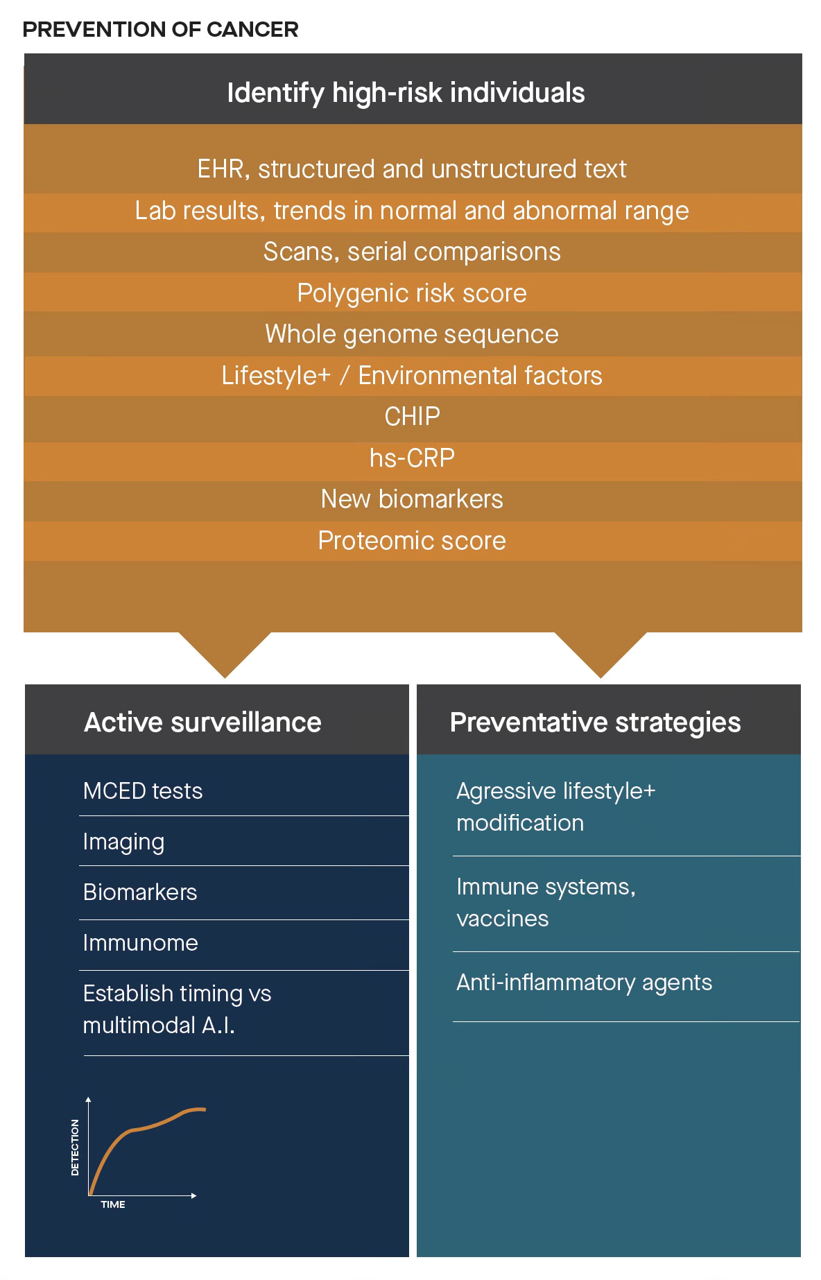 Instead our healthcare now is centered on treating these diseases, which has limited success for many cancers and even less, thus far no disease-modifying impact, for neurodegenerative diseases (Alzheimer’s and Parkinson’s). No less, there’s the profound economic benefit of primary prevention for reducing the cost of such treatments, such as tailored oncology drugs or support of people with dementia in long-term care facilities. I hope this brief review will convince you that primary prevention is a great and largely unfulfilled need, that in light of recent advances it should be given the highest priority. The key problem is that we haven’t had the ability to do it. Until now.