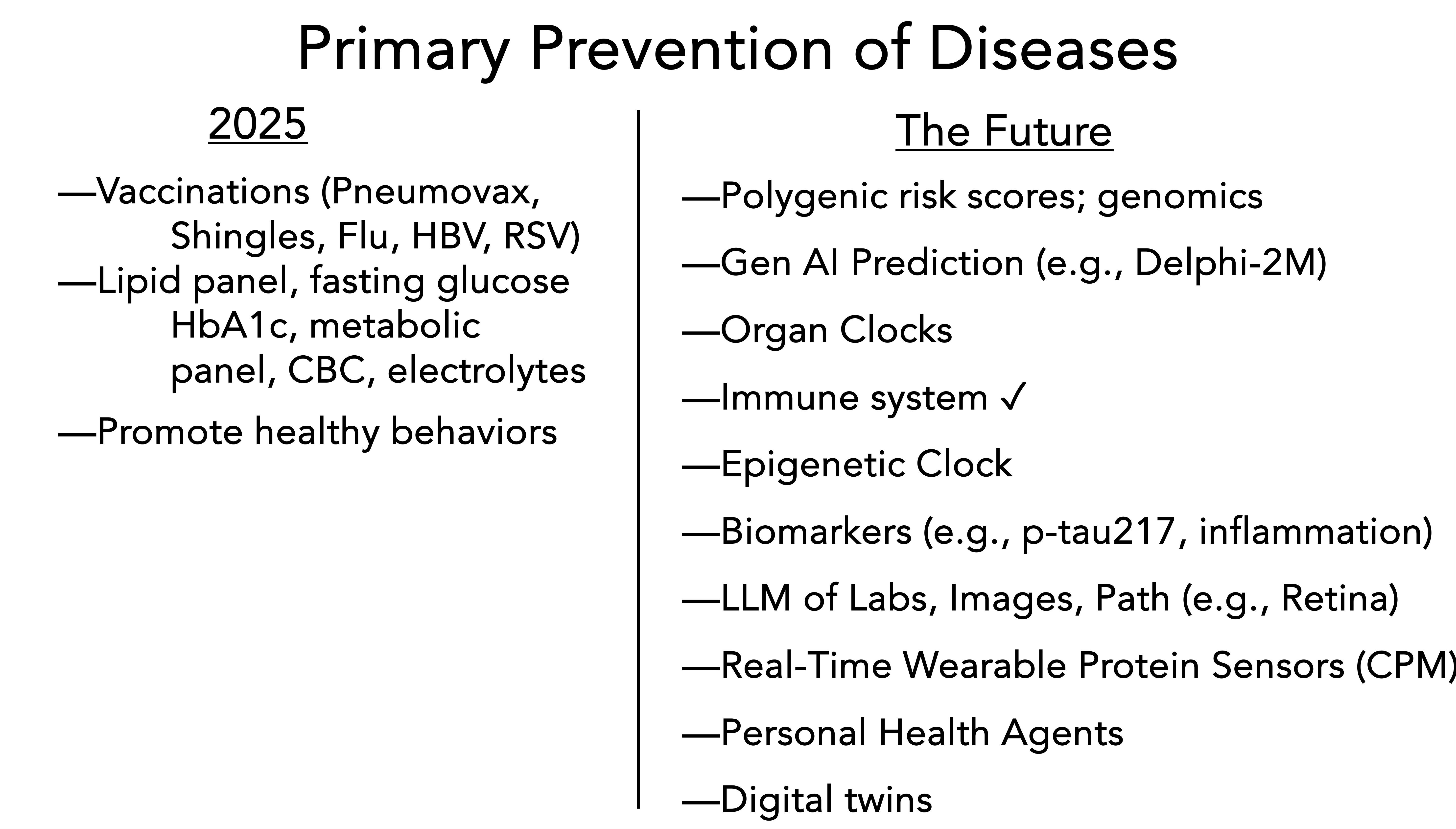At right, the future ,with many layers of new data that are already available (like p-tau217, polygenic risk scores, genomics). And many that will be available soon, such as organ clocks, an immune system clock and comprehensive assessment, A.I. of the retina, your images, and labs (trends in your “normal” lab values without an asterisk can be quite meaningful with A.I., as I previously reviewed). Eventually CPM and digital twin information resources (learning from nearest neighbor in our species) will be added to take primary prevention to an even higher level.