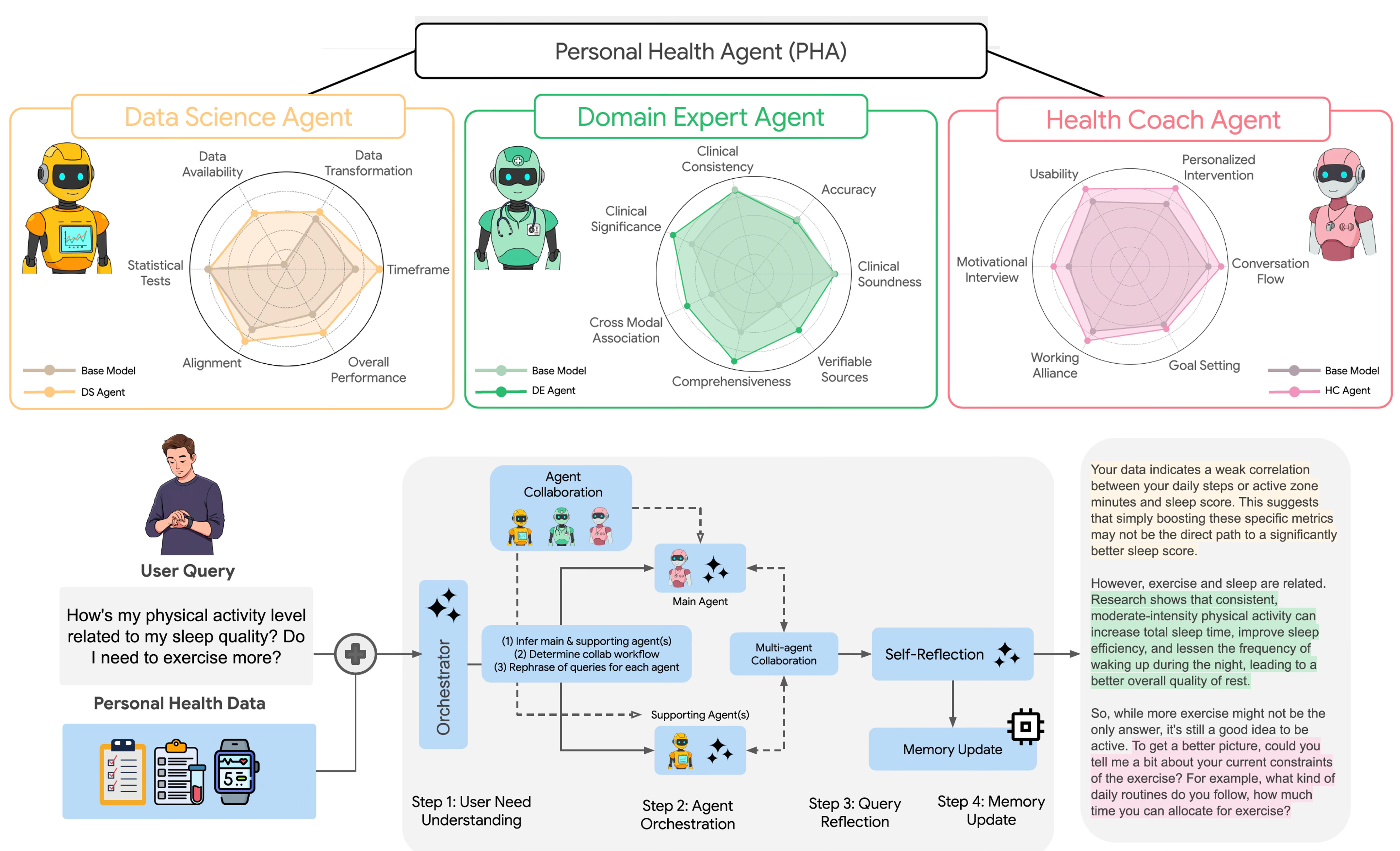 It’s a tall order because an analytic approach for doing this represents a formidable, previously unmet challenge. Just time-series analysis of multiple continuous data outputs from sensors had previously shown little progress. But with 3 A.I. specialized agents, one with expertise in data science, another a medical domain expert, and a third working as a health coach agent, the personal health agent performed exceptionally well according to benchmark ratings by human health experts (see the performance wheels below). The teamwork is coordinated by a project manager or orchestrator (bottom schematic) that harmonizes the work and output of the 3 agents across 4 steps. This is an important advance since we know lifestyle factors are critical for helping to prevent diseases, but we have not had a way to work with the multimodal data, get intelligence from it. Previously, we’ve basically been data collectors and have had limited interpretability restricted to one type of input (such as sleep data).