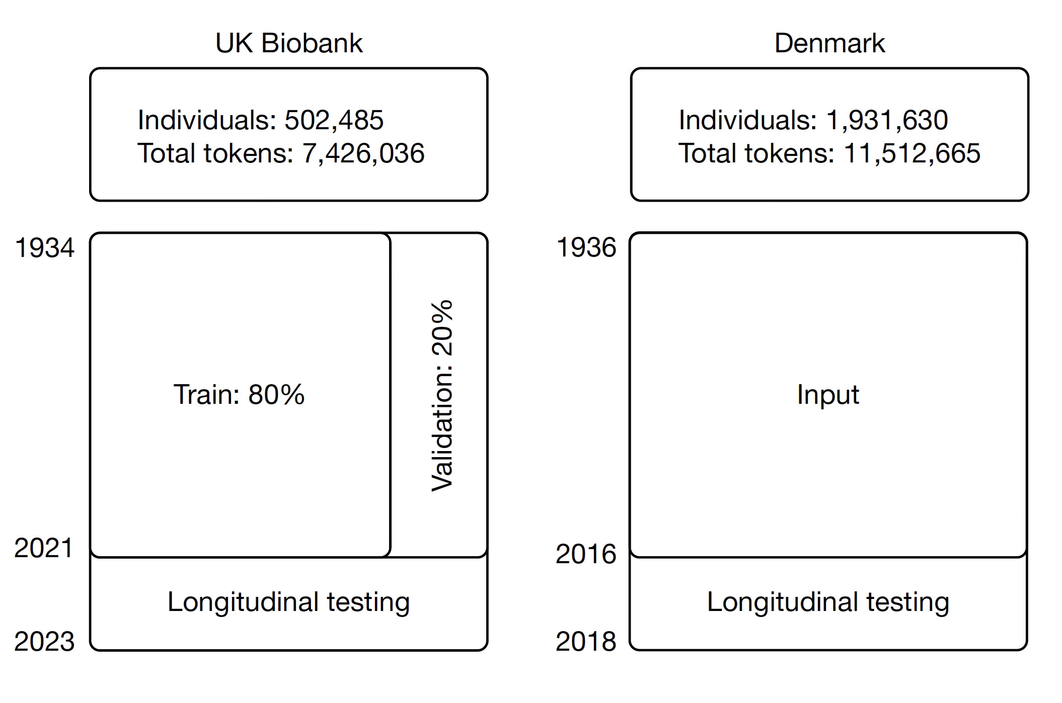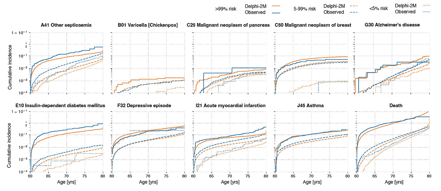 Of course, there are many limitations to Delphi-2M, such as biases related to inputs of data. For example, people who were hospitalized had clusters of diagnoses attributed to being in a hospital, a type of data collection bias. There are ICD-10 disease token biases. And there were marked differences between healthy, younger volunteers in theUK Biobank vs sampling of the Danish population, but surprisingly little difference in model performance.