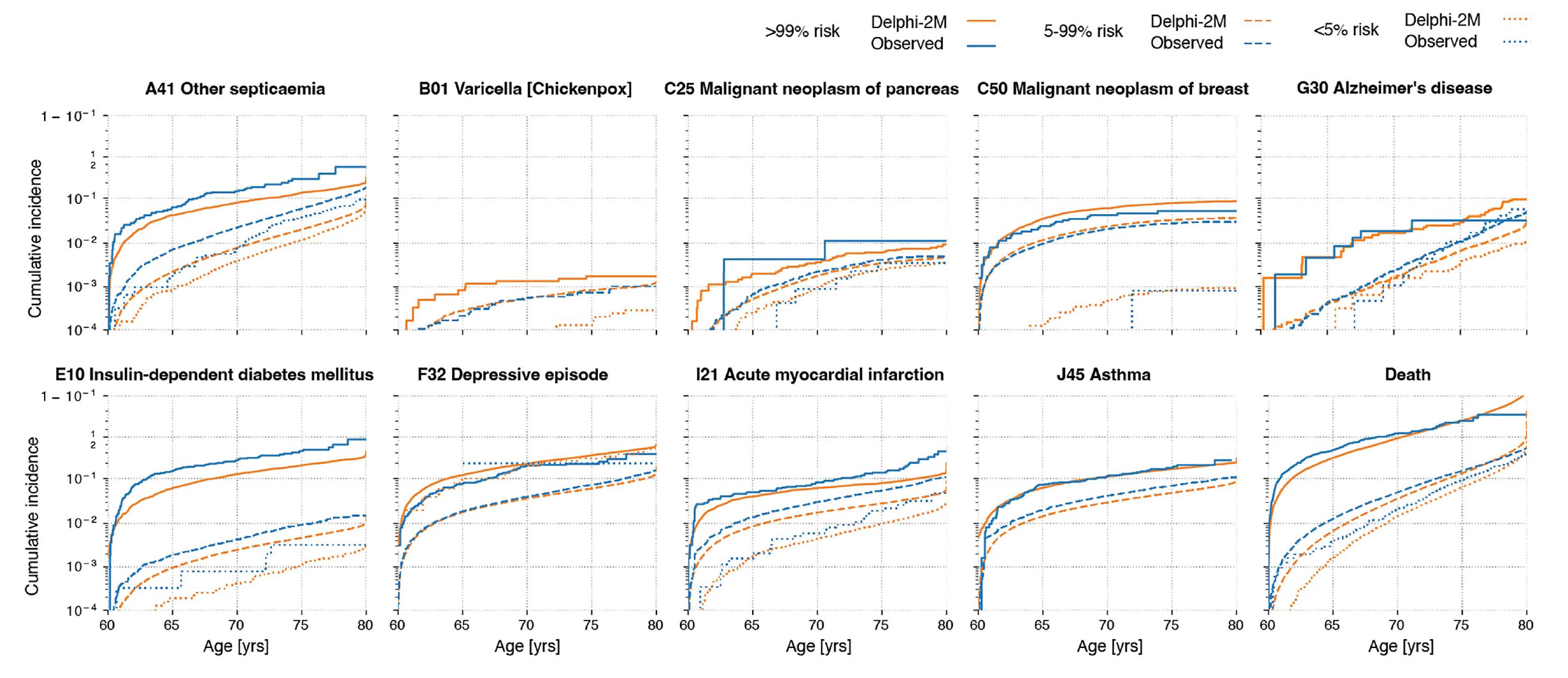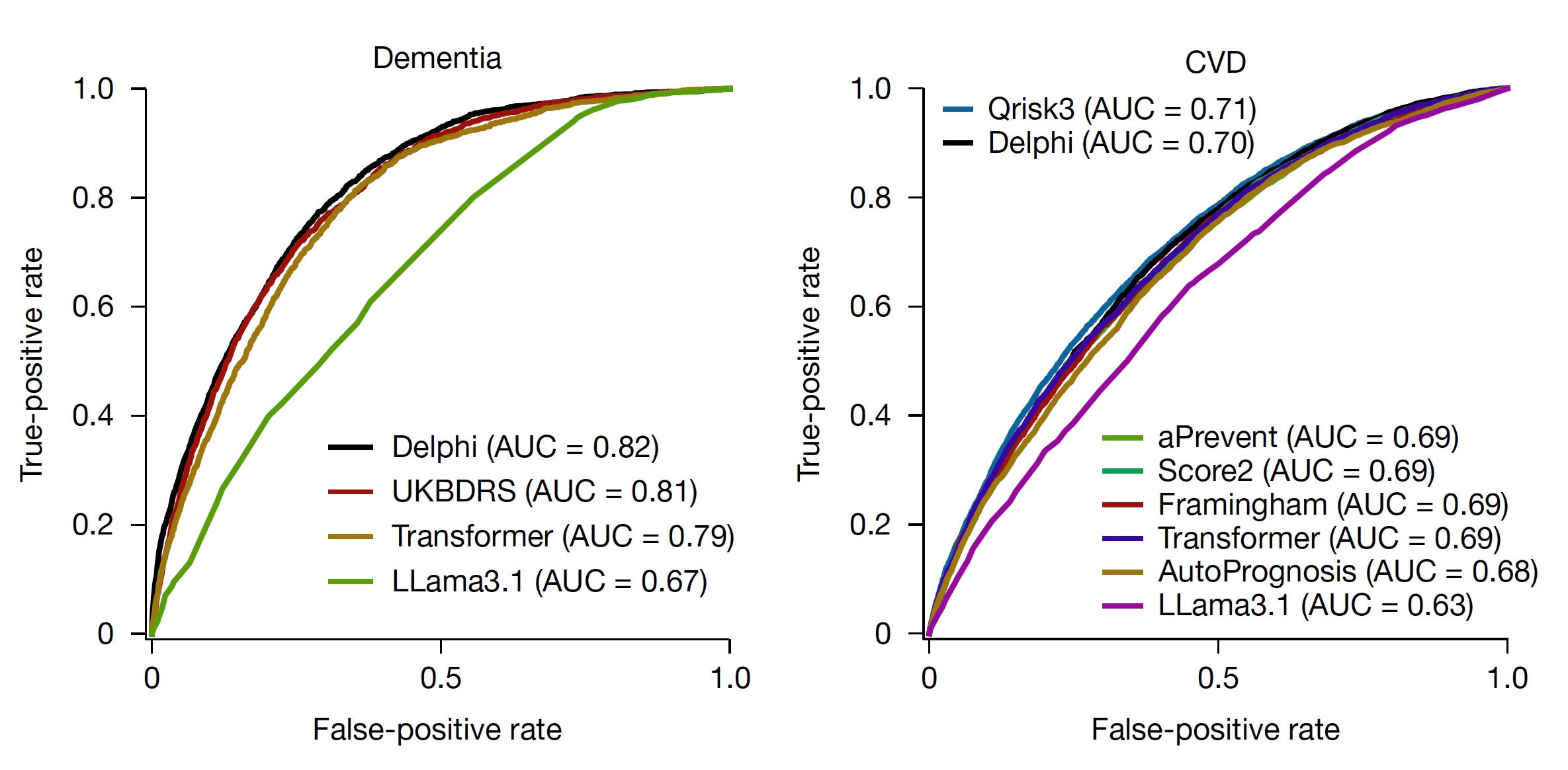 Across >1,000 diseases, which is essentially the complete list of International Classification of Diseases (ICD-10), the Delphi-2M AUC (area under the curve, performance) was 0.76, and 0.70 over a 10-year span for prediction. The model was as good or slightly better than the best current single disease predictive models for dementia or heart disease (see below), and most others, but worse for Type 2 diabetes using HbA1c as single marker. Importantly, it predicted not just one but the multiple diseases (←when that risk was present) for an individual and the timing of appearance for each disease.