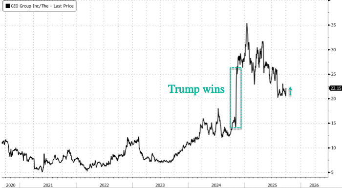 Shares of GEO jumped nearly 9% in late-morning cash trading in New York, marking their biggest gain in 6.5 months. Despite the rally, the stock remains down 20% year-to-date, though still trading well above levels when prices spiked after a Trump presidential win in early November.