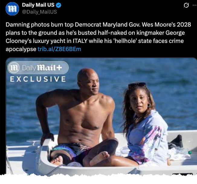 Meanwhile, Maryland's leftist Gov. Wes Moore was recently spotted half-naked on mega leftist George Clooney's luxury yacht in Italy.