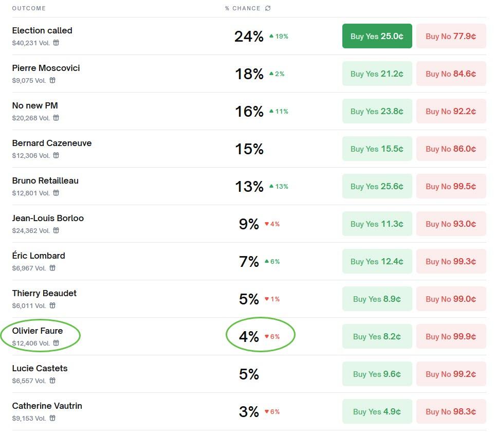 According to Polymarket, Faure remains a long-shot... but with a 25x return if he is picked, it's worth a shot to bet that the French will appoint a socialist.