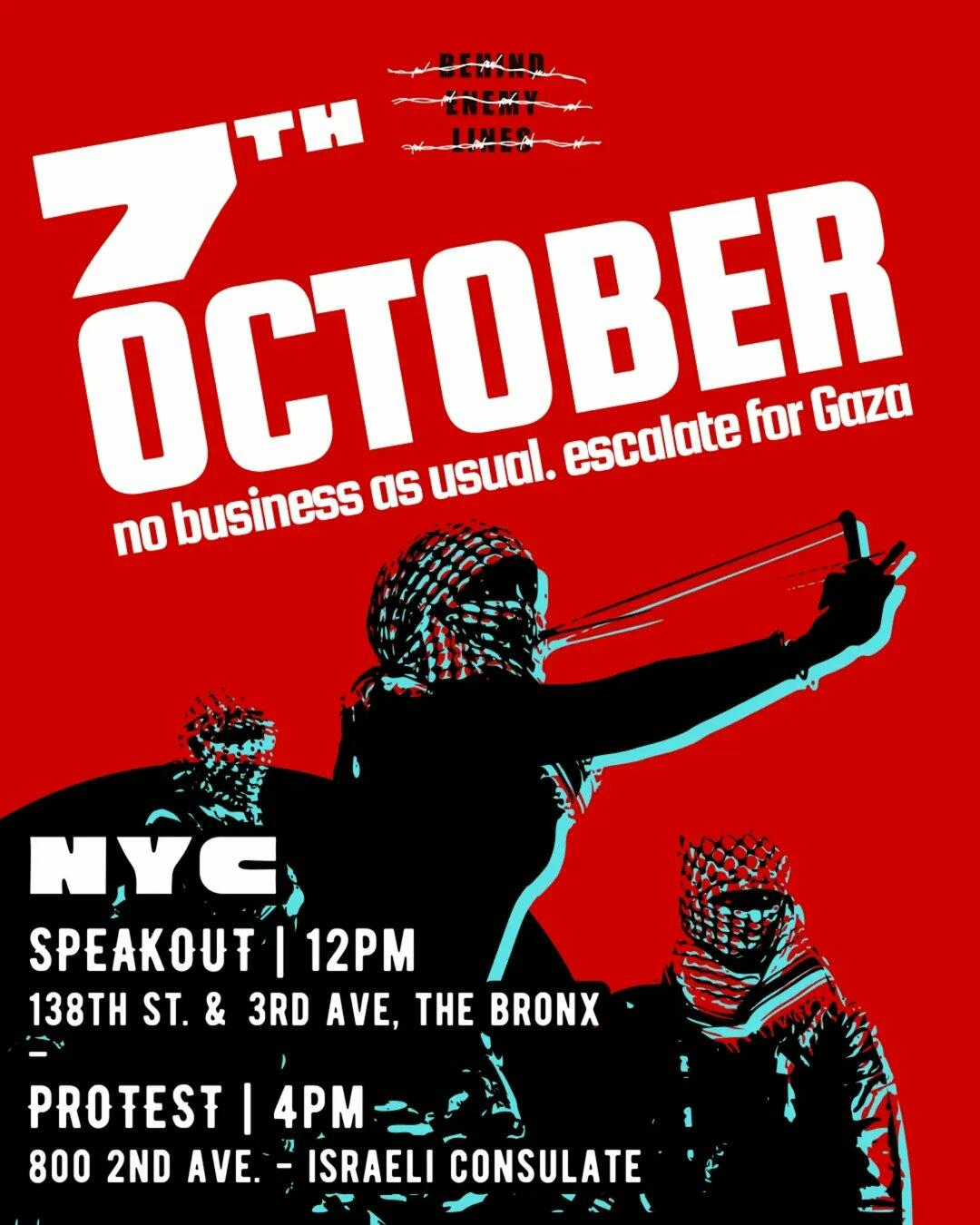 "On the second anniversary of the Al-Aqsa flood, Behind Enemy Lines is calling on everyone to escalate for Gaza and shut down business as usual," the website continued.