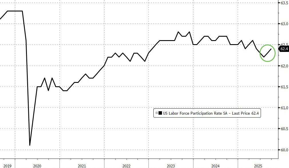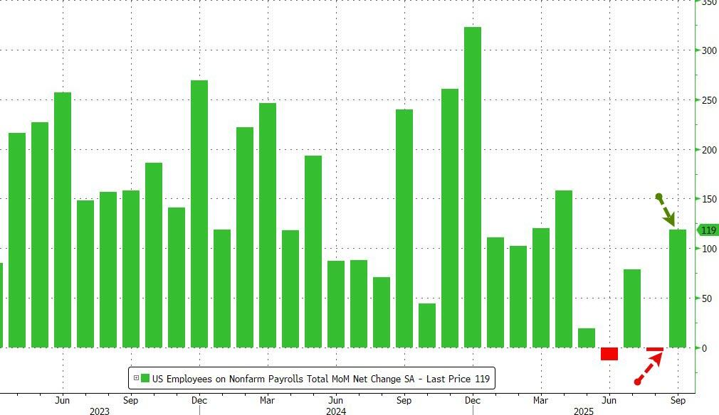 We also said that if today's jobs number is atrocious, the Fed would once again be viewed as being behind the curve. So perhaps working in conjunction with the newly returned BLS employees, the outgoing Fed chair snuck in a pointer or two, and in an attempt to avert allegations of blowing up the economy, moments ago the BLS reported that the (delayed) September number came in a stronger than all estimates 119k jobs...