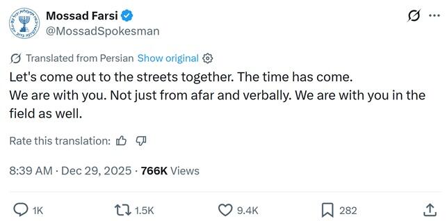 "Let’s come out to the streets together. The time has come. We are with you. Not just from afar and verbally. We are with you in the field as well," the account, which Israeli media is treating as an official mouthpiece for the Mossad, said in Farsi.