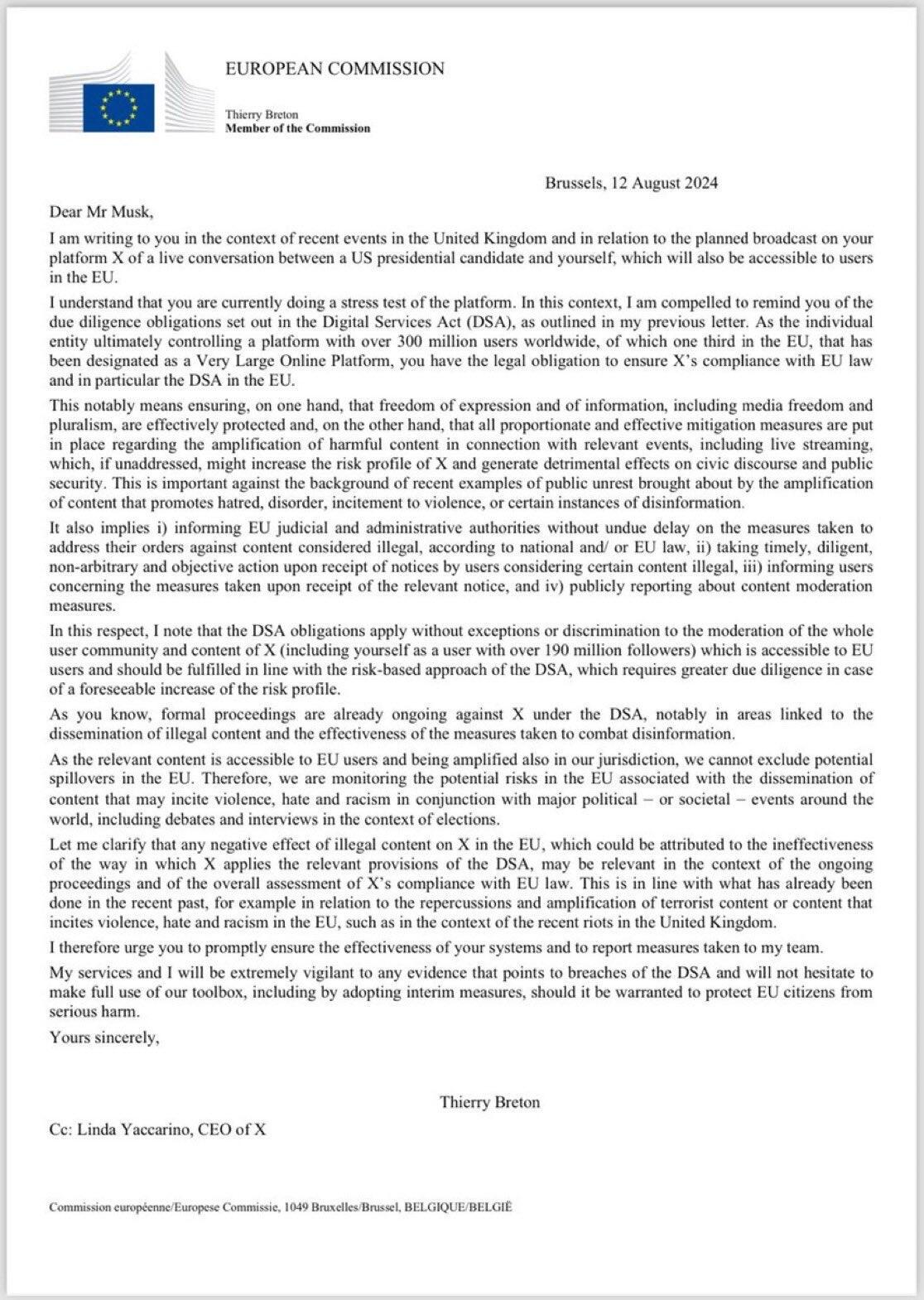 Further, Musk brings receipts showing the European Union sent him a formal letter demanding that he censor Donald Trump during the 2024 US presidential election.