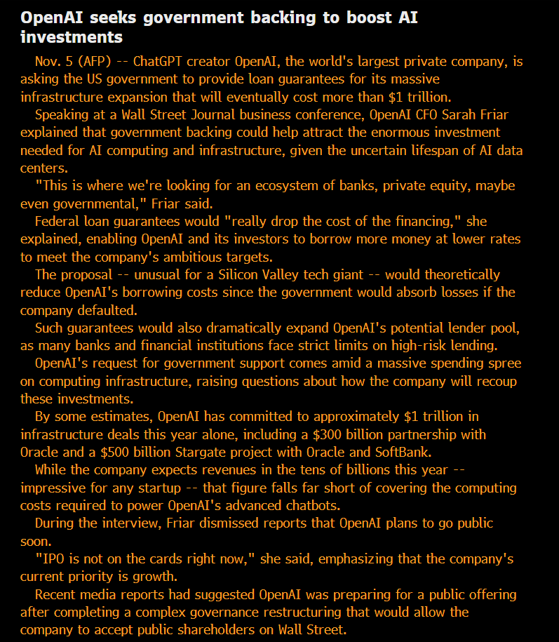 What happened on that date? That was the day of the infamous All Things podcast, in which Brad Gerstner (an OpenAi investor) pointed out that the emperor is, indeed, naked and asked Sam Altman how a company with $13BN in revenue can afford $1.4 Trillion in commitments. Altman's non-reply? “Happy to find a buyer for your shares.” Translation: No answer... and how could Sam possibly answer: after all there is no way on earth that OpenAI could ever grow into its future obligations absent a miracle, an act of God... or uncle Sam.