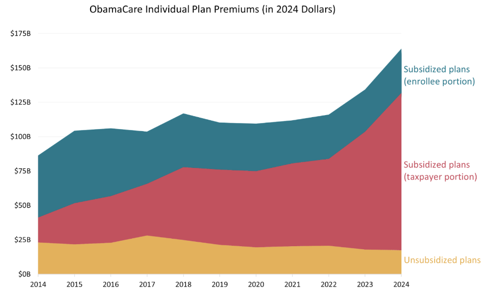 Using health insurers’ mandatory filings, our study, published Friday in JAMA Health Forum, shows that the ObamaCare individual market has become a money pit for taxpayers. In 2024 they paid nearly 80% of the premiums for subsidized plans–compared with only 30% in 2014.