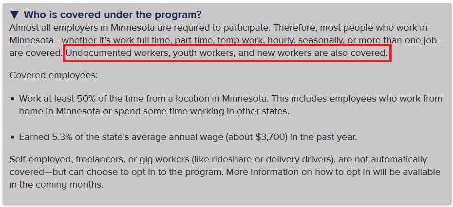Under the Minnesota Paid Family and Medical Leave Program which Walz signed into law ahead of its Jan. 1 start date, "undocumented workers" will receive benefits, according to the Minnesota Chamber of Commerce's FAQ page.