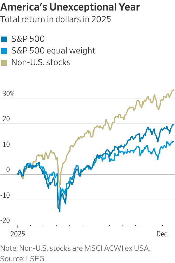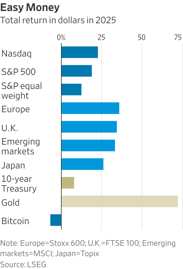 While TACO caught on, the ABUSA, or “Anywhere But U.S.A.,” trade also did extremely well. It was one of the best calls of the year as a cratering dollar and booming markets meant stocks in the U.K., Europe, Japan and emerging markets all beat both the S&P 500 and the Nasdaq composite. European stocks, propelled upward by German stimulus plans, soared 36% in dollar terms including dividends, almost double the S&P’s 19%.