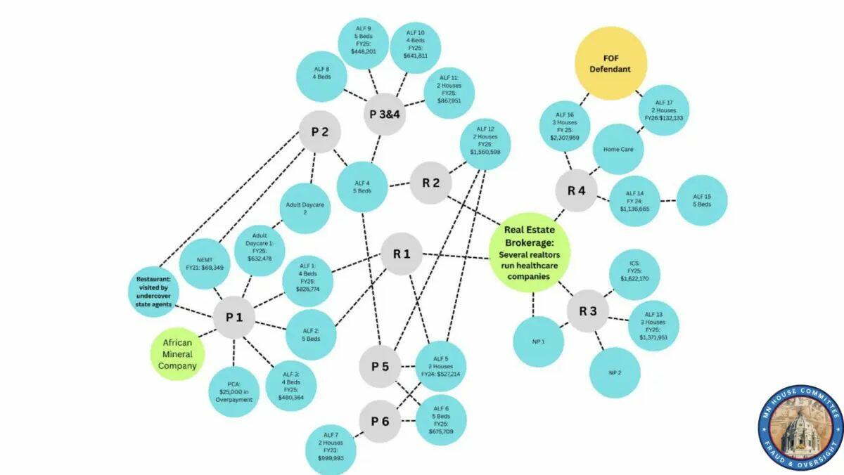 A chart that Minnesota Rep. Kristin Robbins presented at a hearing shows how an indicted fraud suspect is allegedly tied to other people, businesses, and taxpayer-funded government programs. Screenshot via The Epoch Times/Minnesota Fraud Prevention and State Agency Oversight Policy Committee